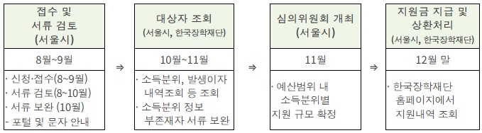 ※ 소득분위는 대출신청일 기준으로 한국장학재단에서 제공한 자료를 기준으로 하나 소득분위 정보가 없는 경우에는 신청자에게 2024년 건강보험료납부확인서(지역,직장가입자) 및 건강보험자격확인서를 제출받아 2024년 소득분위(월평균)를 기준으로 지원 여부 검토 예정